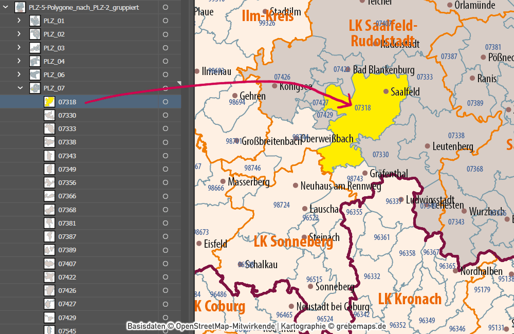 Die PLZ-5-Nummer einer PLZ-5-Fläche ist im Ebenen-Menü direkt über den Elemente-Namen (z.B. „45276“) zu finden und auszuwählen.