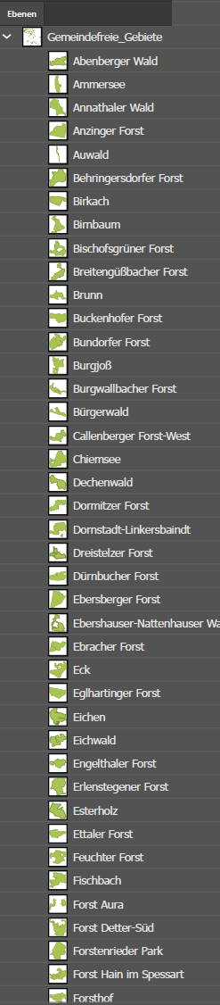 - Die gemeindefreien Gebiete liegen in einer Ebene und jede Fläche ist im Ebenen-Menü mit dem in OpenStreetMap hinterlegten Namen (z.B. „Perlacher Forst“) benannt.