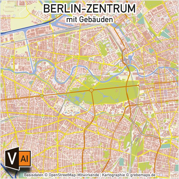 – Berlin-Zentrum Vektorkarte mit Gebäuden Basiskarte, Karte Berlin Zentrum mit Gebäuden –