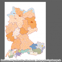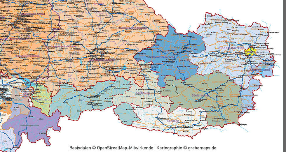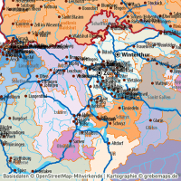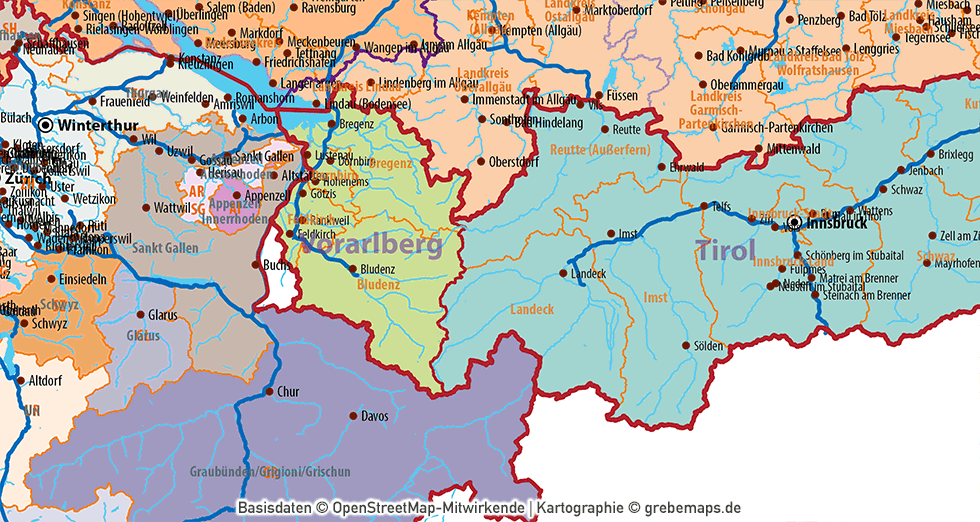 - Die Basiskarte enthält die Bundesländergrenzen (D-A) und Kantonsgrenzen (CH) sowie Landkreisgrenzen (D) und Bezirksgrenzen (A).
