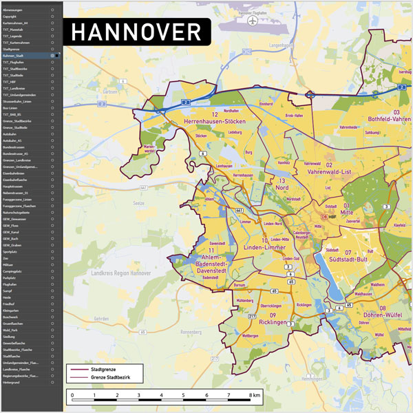 – Hannover Vektorkarte Stadtbezirke Topographie, Karte Stadtplan Hannover, Vektorkarte Hannover –