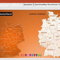 - Auf alle Folien können Sie manuell Ihre Themen/Sachverhalte legen (z.B. Ihre Niederlassungs-Standorte nach Regionen). Sie können entweder die schon auf den Folien platzierten grafischen Standort-Markierungen verwenden oder Sie können Ihre eigenen Standort-Marker einfügen und auf die Karte/n manuell legen.