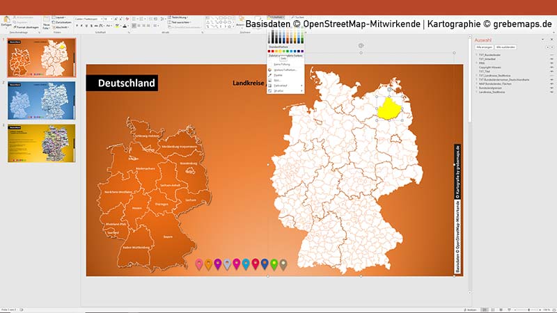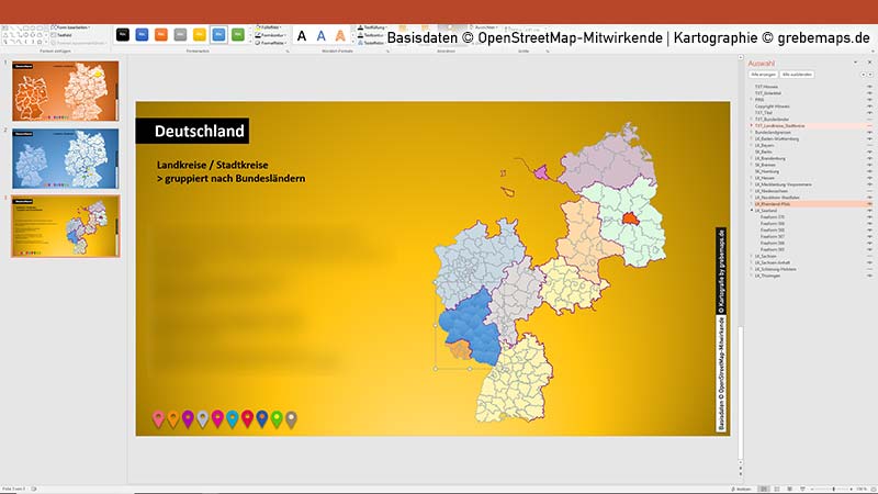 - Die Folien enthalten die Landkreise / Stadtkreise für gesamt Deutschland als Vektordaten; die Flächen sind einzeln anklickbar und auswählbar und von Füllung, Umriss, Effekt bearbeitbar; die Namen der Landkreise / Stadtkreise können ein-/ausgeblendet.