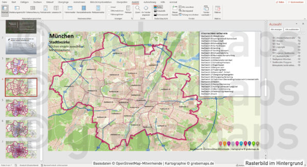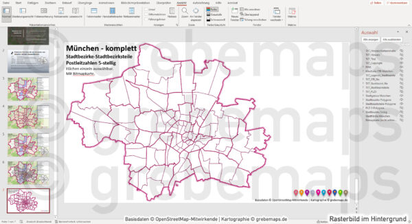 PowerPoint-Karte München bestehend aus Vektordaten mit einzeln auswählbaren Flächen (Stadtbezirke, Stadtteile bzw. Stadtbezirksteile, Postleitzahlen) und einem Rasterbild München-Umgebung.