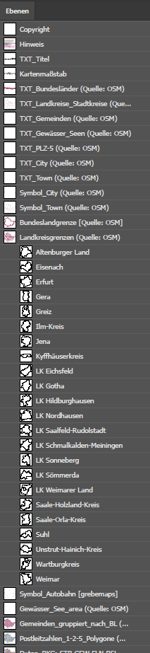 - Die Landkreise / Stadtkreise liegen gruppiert in einer Ebene und sind ebenso alphabetisch sortiert nach deren Namen angelegt (LayerElementName = Landkreisnamen) im Ebenen-Menü.