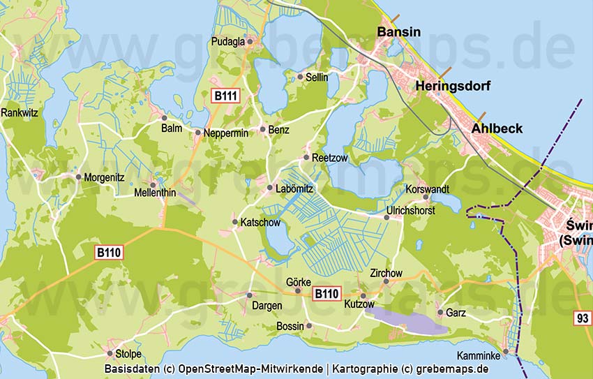 Usedom Vektorkarte Topographie mit Gemeindegrenzen / Karte Insel Usedom / Basiskarte Usedom / Übersichtskarte Usedom