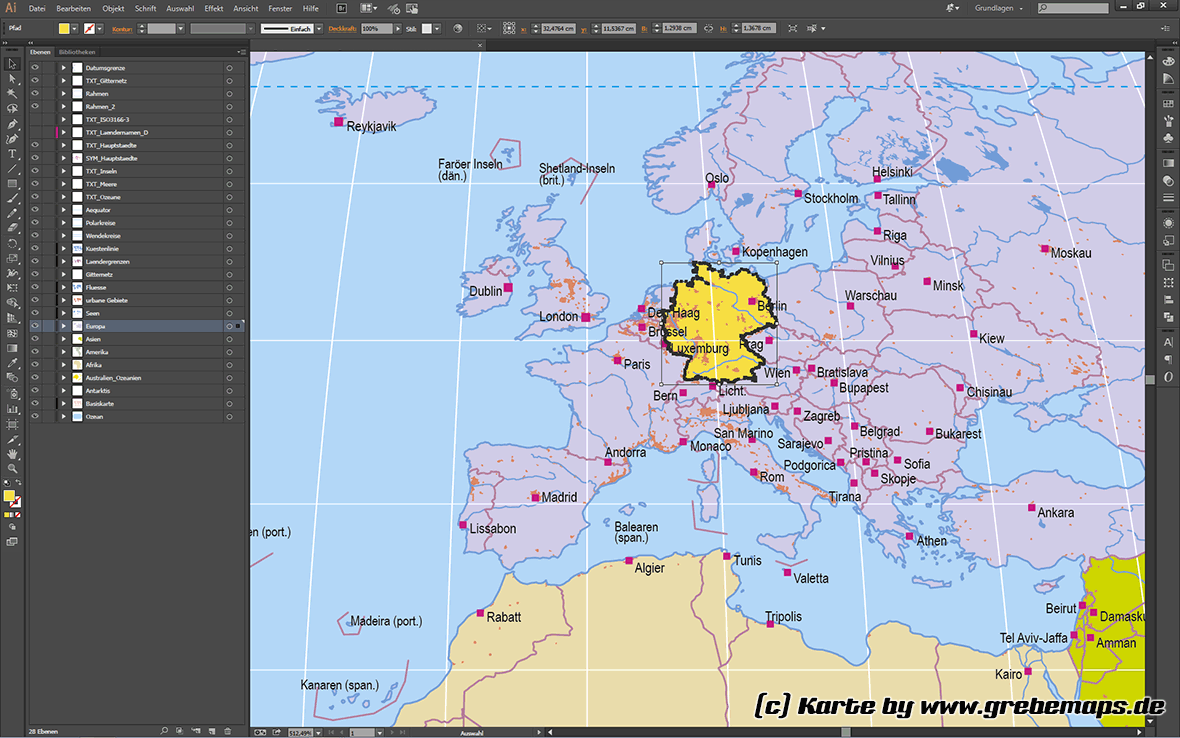 - Länder als Flächen angelegt, einzeln einfärbbar